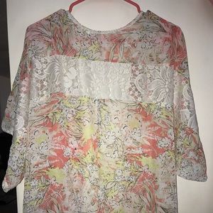 Short sleeve floral with lace accent cardigan/kimono. It is sheer and perfect for spring/summer ! Worn once, it's a beautiful piece!