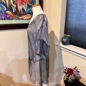 Gorgeous sheer flowing top is hand painted in shades of blue on sheer silk chiffon