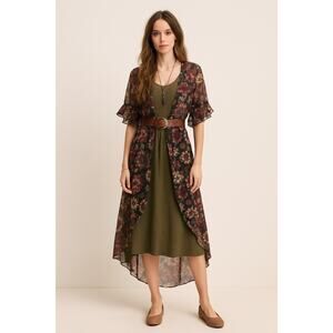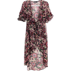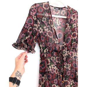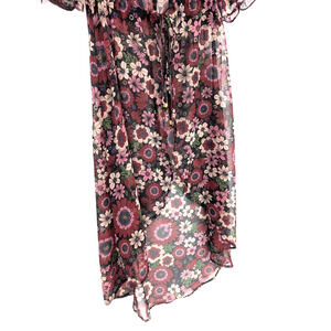Sheer Chiffon Retro Boho Floral Ruffle Trim Hi Low Hem Cottage Prairie Kimono