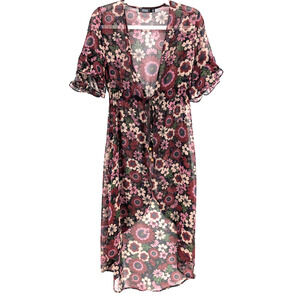 Sheer Chiffon Retro Boho Floral Ruffle Trim Hi Low Hem Cottage Prairie Kimono SM