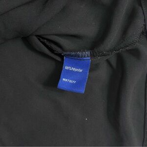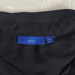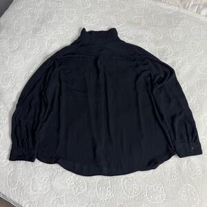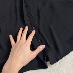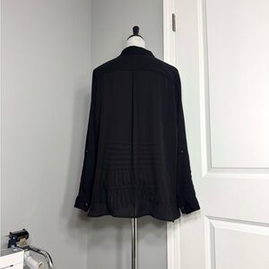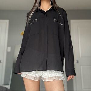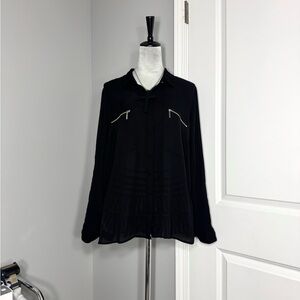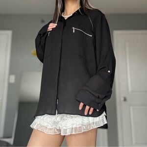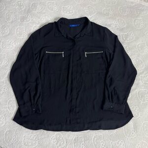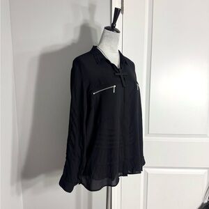 Basic black slightly sheer button up convertible blouse / shirt with folded collar, rolled-tab cuffs, and zipped pocket detail in front. In a georgette construction, this top can have an oversized fit and is made with soft, comfortable, lightweight, flowy material - great for work, formal occassions, business casual or everyday outfits. ✱ Brand: APT. 9 ✱ Size: XXL ✱ Flaws: none major Measurements (inches) Width: 24.5 Length: 27.5 Sleeve: 24 Shoulder: 16 Hem: 26