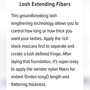This groundbreaking lash lengthening technology allows you to control how long or how thick you want your lashes. Apply the rich black mascara first to separate and create a lush defined fringe. After laying that foundation, it's super-easy to apply the slender nylon fibers for instant Òmiles-longó length and flattering thickness.