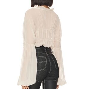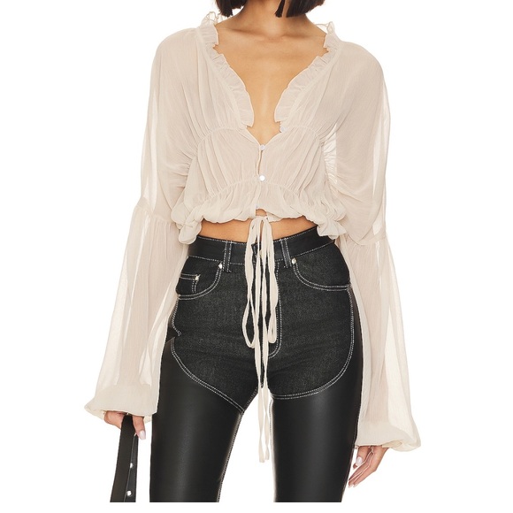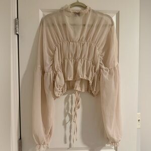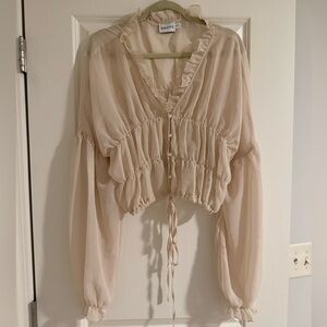 Cream ruffle-trim blouse with a deep V and adjustable tie-front. Lightweight sheer fabric and billowy long sleeves