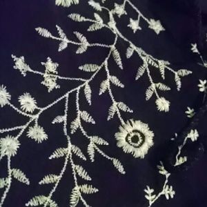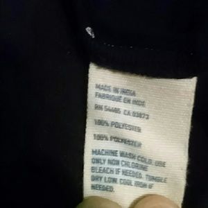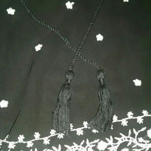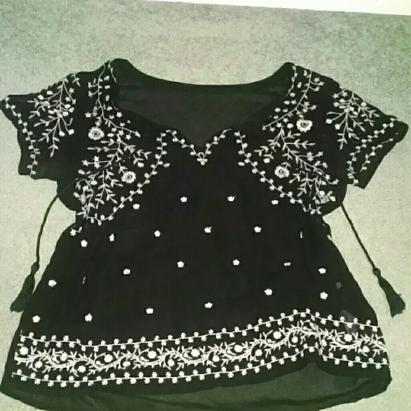 100% Polyester. Black, short sleeve top, w/ ivory colored floral embroidery, with decorative tassels attached on collar. Embroidery is NOT itchy. Worn a couple of times, in great condition!! Embroidery is only on the front and the back of the sleeves. Very light and flowy, super breathable and very comfortable!