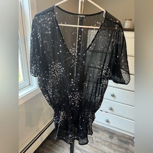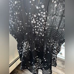 Sheer black top with white flowers.