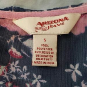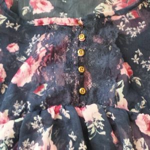 Sheer floral blouse by Arizona Jeans company. In the top middle of the blouse there is a small section of lace with four buttons.