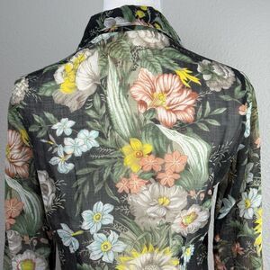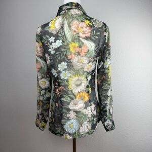 Sheer Floral Button Up Blouse Womens Size S Black Multicolor 70s Romantic Top