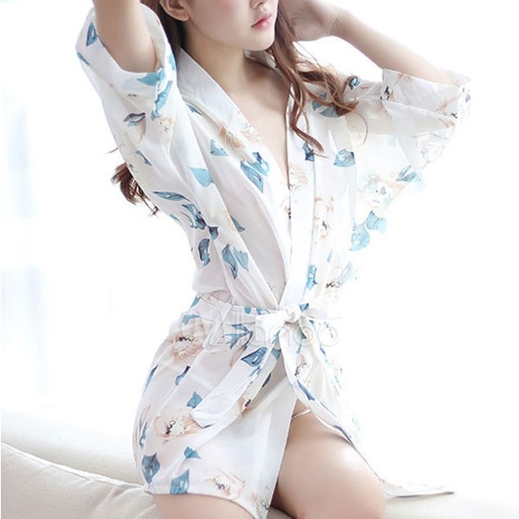 Sheer floral kimono robe with sash belt to tie around waist. Perfect for lounging, dressing up with lingerie, or even as a beach cover up.