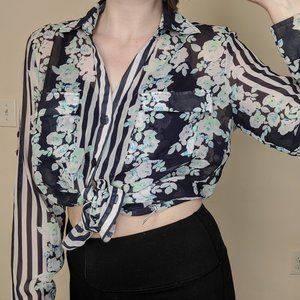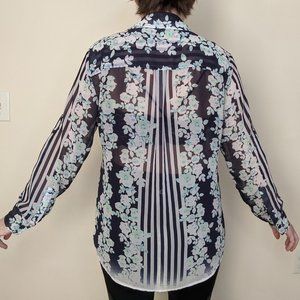Beautiful sheer floral and striped patterned longline button up from New York and Company. Size medium. Looks super cute tied in front or with skirts. Colors are navy blue, white, and teal / turquoise.