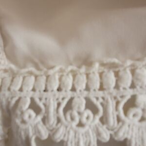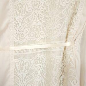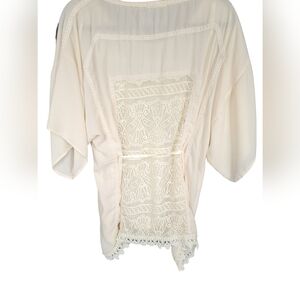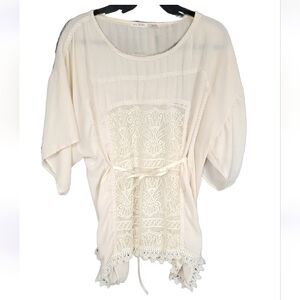 Elegant and sophisticated, this blouse features intricate lace and crochet details, bell sleeves, and a satin ribbon belt accentuating its stylish look.