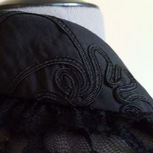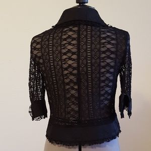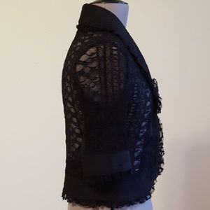 Dressy black lace jacket has a shawl collar with ribbon embroidery details. Single hook closure. Excellent condition from a non-smoking home. Wear it with a slinky black slip dress or jeans and a cami, and you're ready for a night on the town!