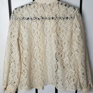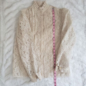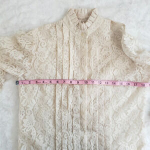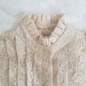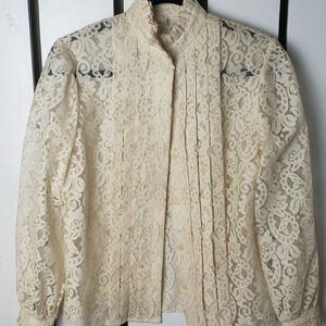 Good Condition, See-Through Vintage Lace Button Up, Ruffled Victorian Mock Neck, Cuffs and Front Detail, Size 8, Cream
