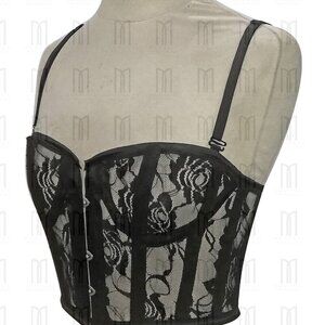 Constructed with high-quality spiral and static steel bones, it delivers excellent structure and waist-cinching support. The nickel brass grommets and satin ribbon laces at the back allow for a customized, secure fit. Perfect for adding a touch of sophistication to your wardrobe, this bustier combines sheer lace with satin details for an effortlessly chic look.