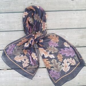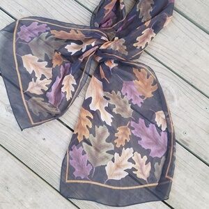 Beautiful sheer Leaf scarf perfect addition to any outfit purse jacket hair accessories there is no name tag or material tag measurement of length side to side 60 measurement of with side to side 13 there is a faint white mark see picture SKU - a 101