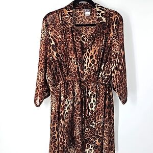 Sheer Leopard Print Shirt Dress Tunic w Button Front & Drawstring Waist