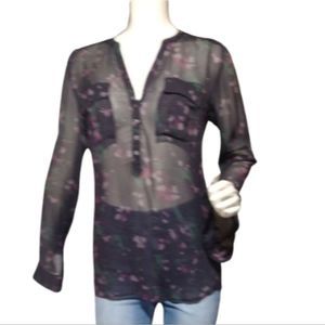 Sheer Long Sleeve V-Neck Top Eddie Bauer Size XS EUC Black & Pink Buttons Pocket