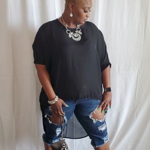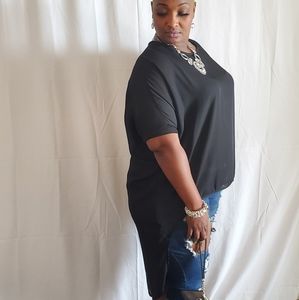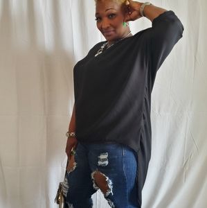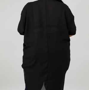 This sheer long tail top features, a non-stretch fabric, round neckline, wide sleeves, long tail, no closures. Model is wearing a 1X. 100% Polyester. Hand wash cold water. Do not bleach.