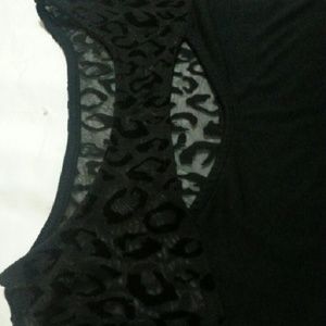 Cheetah print on sheer sleeves and top part of dress, open slit at d?collet? area, tag on back removed barely visible marks of that