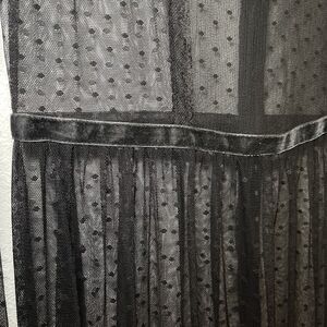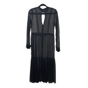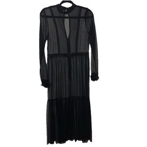 The Who What Wear Sheer Maxi Dress in size S is a goth romantic gown perfect for club wear. It features ruffle cuffs, a high neck, and long sleeves. The dress is made of black mesh fabric with a solid pattern, and it has a button closure and a backless design with geometric accents. This witchy and sexy dress is versatile for various occasions like parties and cocktails, reflecting themes of designer, punk, and metal style.