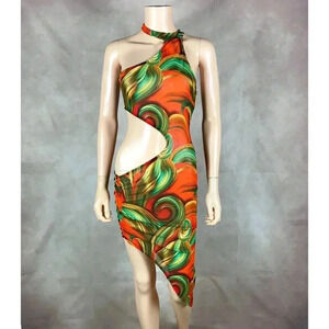 Sheer Mesh Cut-out Abstract Print Asymmetrical Bodycon Dress from MAY PINK