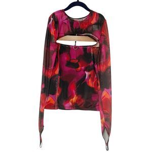 Turn heads with this bold and sultry mesh two-piece set, featuring a long-sleeve cropped shrug top and high-waisted mini skirt with a side slit. The fiery red and magenta floral abstract print gives a Y2K, club-ready aesthetic perfect for night outs, festivals, or statement fashion shoots.