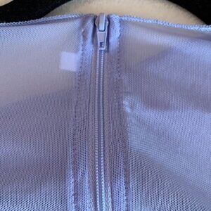 This sheer mesh corset-inspired top features a flattering cutout design and structured stitching. The light blue tone adds a trendy and elegant touch.