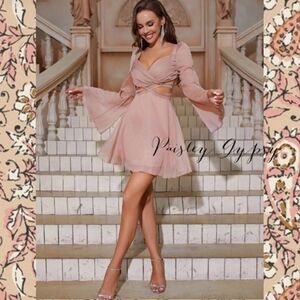 The ultimate flirty Dress perfect for upcoming dances and Formal events. A semi sheer sparkling pink fabric with a slight poof at the shoulders of the beautiful long sleeves finished with a bell flare at the wrists. Criss Cross cutouts with lace detail show just a bit of skin, flirty, and just a bit sexy. Flare fit with thigh high length. This dress is truly fit for any princess ready to dance!