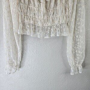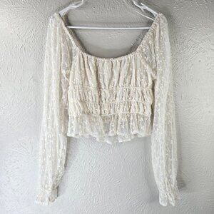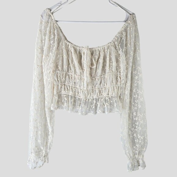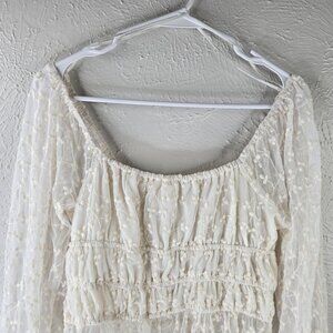 Sheer Off Shoulder Blouse M White Smocked Bell Sleeve Coquette Fairy Boho Top