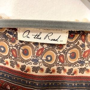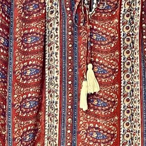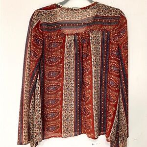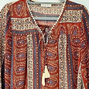 Sheer Paisley Boho Blouse with Bell Sleeves. Tassels on tie keyhole neckline. Pretty India-inspired pattern in burnt orange rust, blue, and cream.