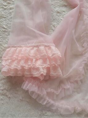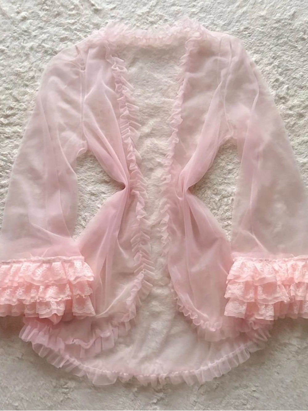 Delicate sheer pink ruffle robe for sleepwear. Soft, lightweight fabric with layered ruffle cuffs and trim. Feminine design perfect for lounging or as a stylish cover-up. Easy to wear and layer over sleep sets.