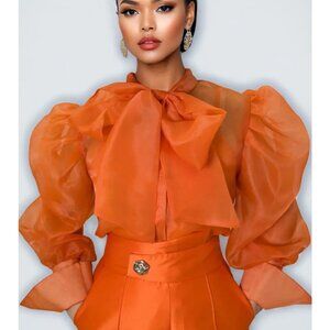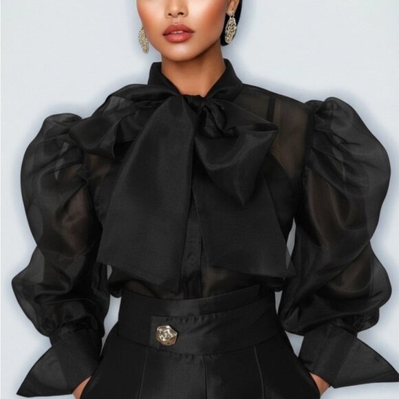 Elegant sheer blouse featuring long puffed sleeves with extended cuffs, a button-down front, and a chic tie-neck detail. Comes with a camisole for coverage, offering a refined, feminine look perfect for both work and evening wear. Paired with the black pants