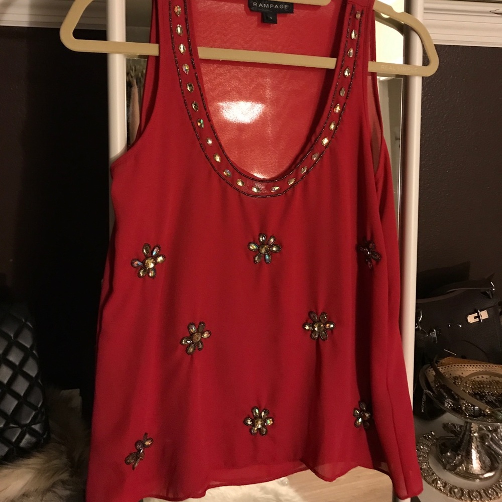 Beautiful red, embellished sheer top. Gorgeous flower designs throughout with beading outline. Light and airy!