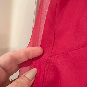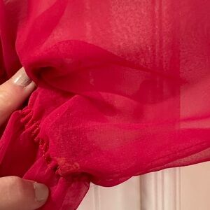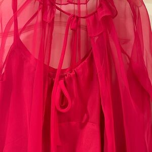 Elegant sheer rasberry colored cover-up with neck tie detail. Perfect for layering.
