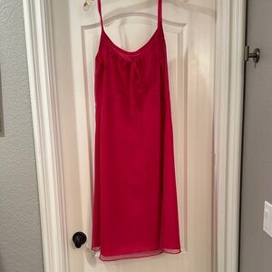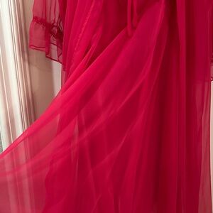 This négligée is vintage and appears to even potentially be hand made. It’s beautiful it has been cherished and loved for decades. It looks like it’s barely been worn if ever— there’s no makers tags that I can find. The neglige is made out of a satin material with a nice duster cover that matches the exterior duster cover both have bows. The duster cover is lovely. I see no damage or errors except for a small discoloration on one of the sleeves by the stitching. There is a small black mark on the back of the négligée. The negligee has not see-through. It has a layer of share over top of the satin like material. I’m not a material expert, but it’s appears to be satin. The stitching might even be hand done in spots. The color of this is raspberry, not pink and not red in between. It’s lovely. It is ready to enjoy. That négligée measures 17 inches in the under arm; shoulder to bottom measurement is 44 inches. It would fit a medium or small. Stunning. Enjoy.!