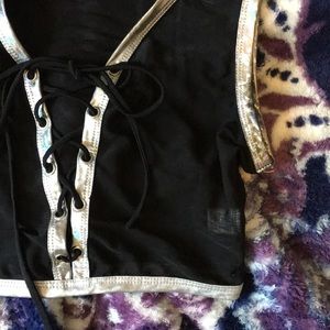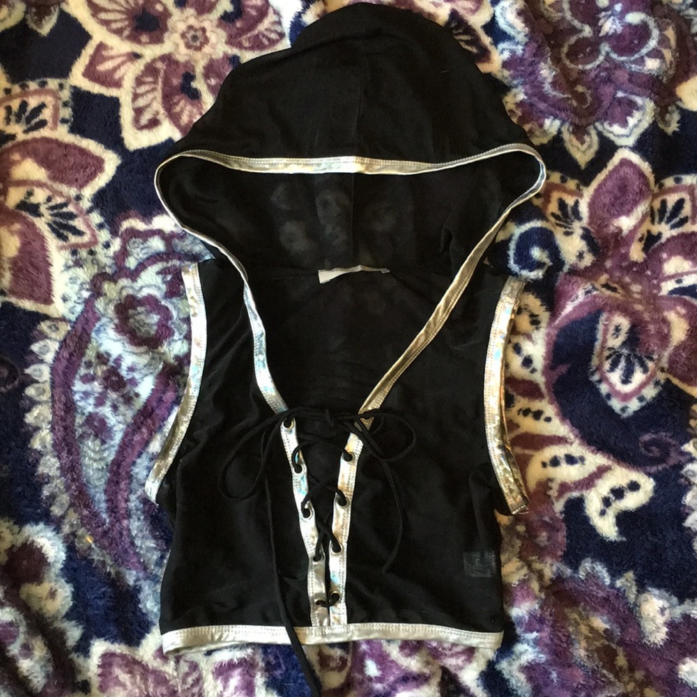 Comfortable, sheer black rave top! The silver trimmings are shimmery. The front tied as well. Very comfortable and looks cute with pasties!