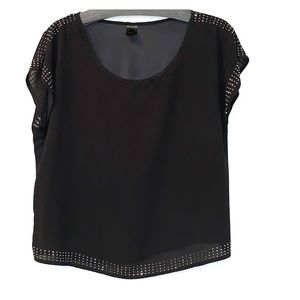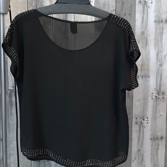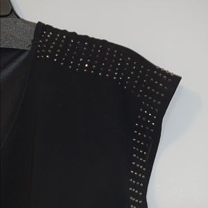 Short sleeve black blouse with rhinestones outline the sleeves and the bottom size large perfect to wear with a pair of slacks or your favorite pair of jeans