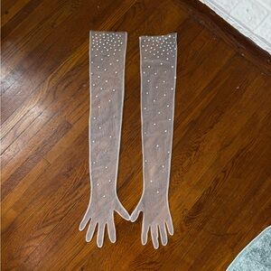 tags: sheer gloves, opera gloves, rhinestone gloves, crystal mesh, y2k glam, coquette, burlesque, costume accessory, statement gloves, festival wear, drag, performance wear, editorial accessory