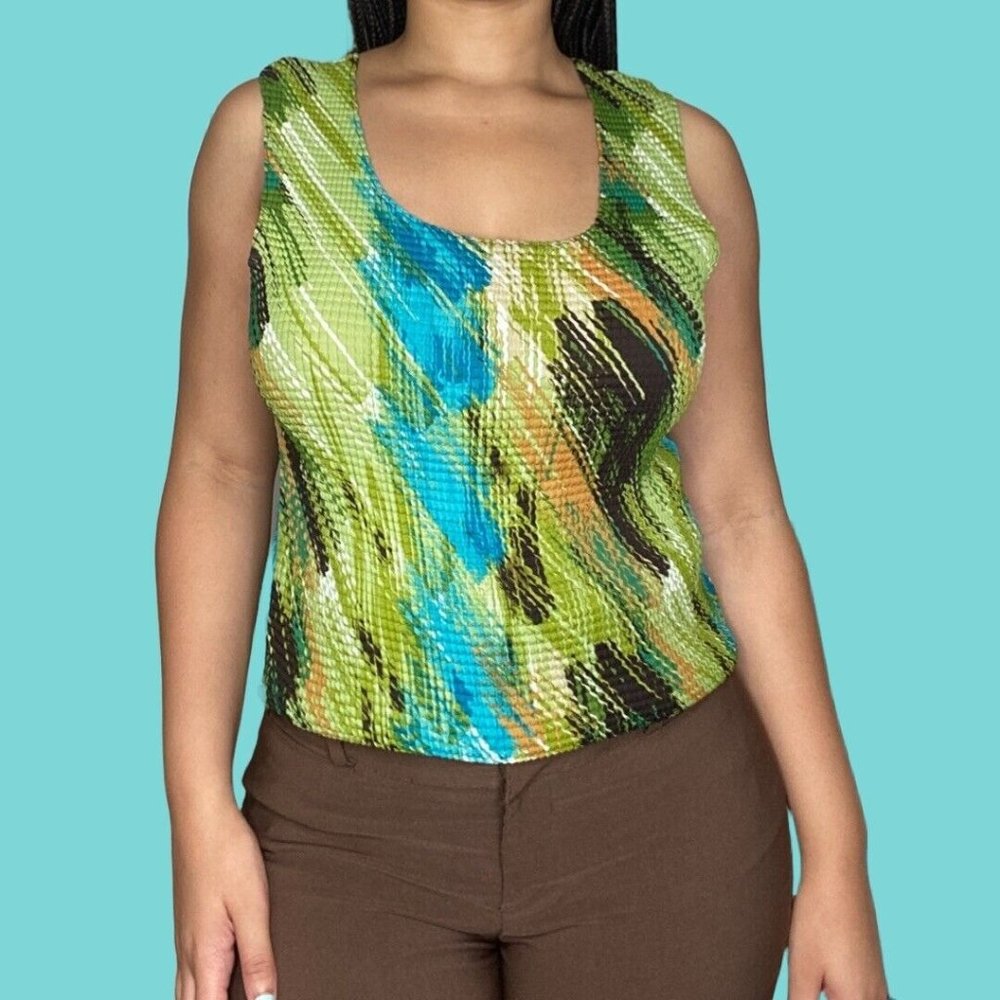 Size: XL, Condition: Pre-owned, good. Stretchy, tiny ribbed/layered fabric, and sheer fabric. Measurements: pit to pit: 19”, waist: 36”, length: 26”.