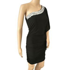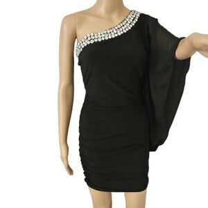 Sheer Ruched Dress M Black Rhinestones Off Shoulder Bishop Sleeve Witchy BodyC. Condition is pre-owned and EXCELLENT condition....no rips, tears, holes or discolorations. Vintage 1990s to early 2000s. Bishop sleeve. Rhinestones along the neckline... All tight and secure. Chiffon overlay on left shoulder. Ruched sides. Slinky and sexy. Made in the USA. Very stretchy. PLEASE SEE MEASUREMENTS!!!