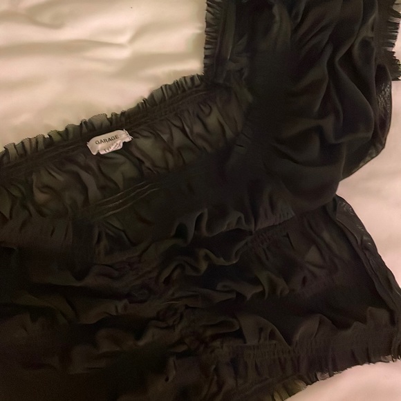 cute black sheer/mesh ruched top. cropped length. drawstring at boob area. barely worn. tag says XS but is loose fit, could probably fit a S/M