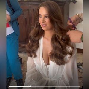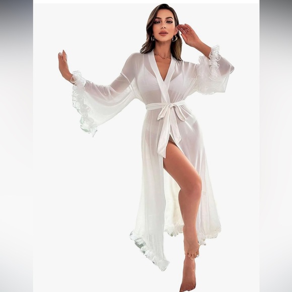 This luxurious white robe features dramatic bell sleeves lined with ruffles and is crafted from a light, flowing fabric. Also includes fabric belt. Perfect for brides!
