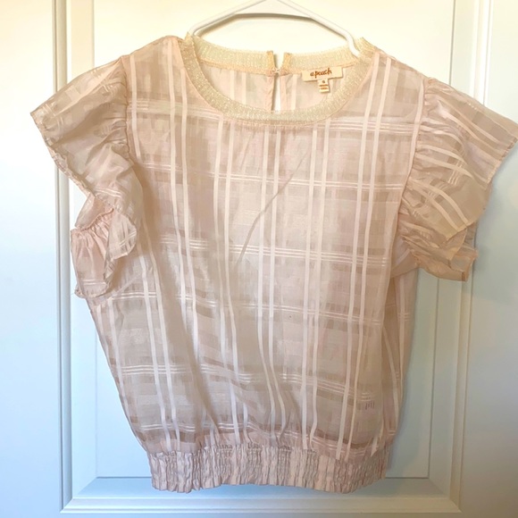 This blouse has it all! Sheer cream coloring, ruffled sleeves, plaid detail. So cute!