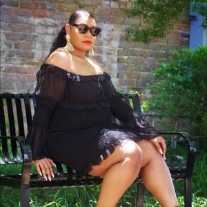 Off-shoulder ruffled black dress. Plenty of stretch & never worn...only for photo shoot, still has tags
