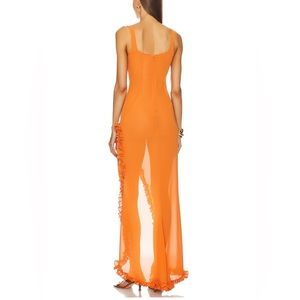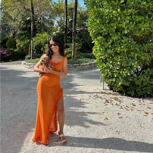 @rosegold1024 I wore it once and I believe the girl I bought it from wore it once. She had it slightly altered on the slit as it was quite high. The last picture is me wearing it for a wedding in the Bahamas so you can still see the slit is still quite high (I’m 5’4”) for reference.