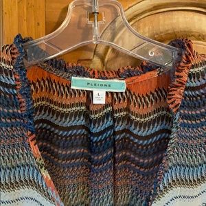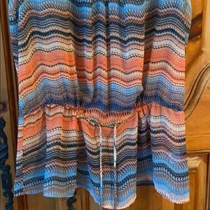 Very pretty sheer shell or sleeveless top with a tiny ruffle trim and drawstring waist. Great under a jacket or worn alone with jeans!