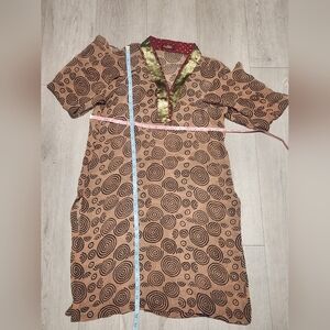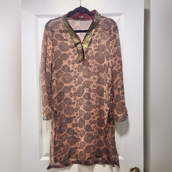 "This stunning Oltre piece doesn’t have a size tag, but it fits like a standard Large. The fabric is sheer with no stretch, so it’s perfect for someone looking for a flowy, relaxed silhouette.