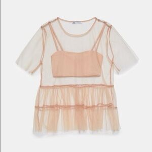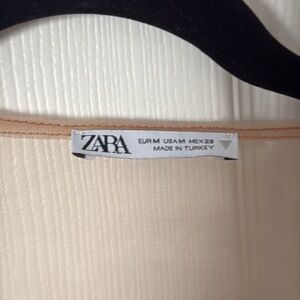 Sheer peplum top by Zara in size medium, tan color, can be worn in 1 million ways. Loose fitting. Excellent condition. Smoke free home.