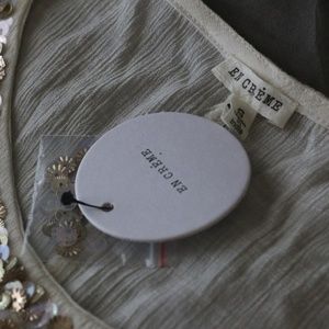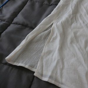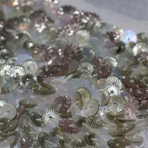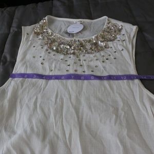 Extra long, sheer, tunic length tank top with sequins along the neckline. Round neckline and side slits on both sides.