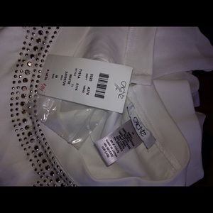 Sheer white top with gems around neckline. Never worn and still has tags.
