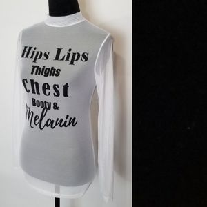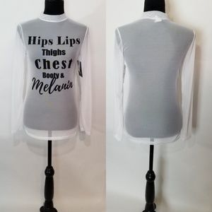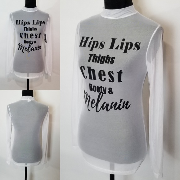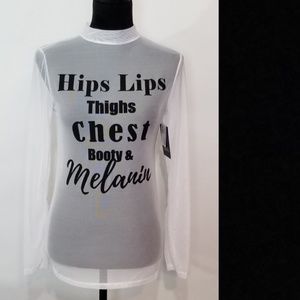 @060853 Hi, thanks for visiting my closet. Melanin gives all people their skin color, etc. If your cells make less Melanin, your skin can be very light. If your cells make more Melanin, your skin can be darker. The top for sale is all about being happy in the skin you are in. I hope this will help.